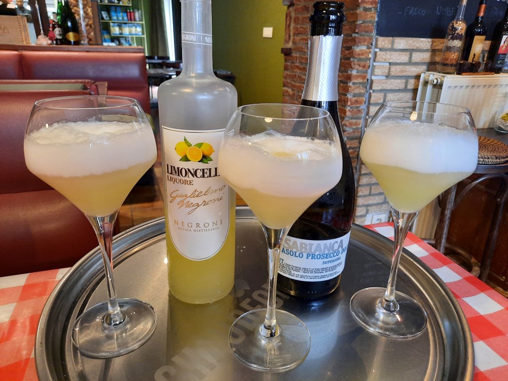 Rassurez-vous, on arrive au bout de ce voyage, il reste bien entendu une douce conclusion, le dessert… La suggestion du jour est un « Sgroupino royal », à savoir un sorbet citron nature agrémenté de belles lampées de Prosecco « Qualita superiore » et de Limoncello Guglielmo Negroni, une tuerie ! La brave 317ème section, ne voulant rendre les armes de la sorte et toujours soucieuse d’un baroud d’honneur, a même eu l’audace d’en commander un second ! Je vous l’avais dit, ils sont fous !
