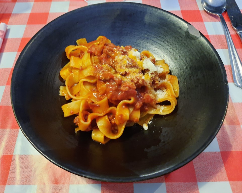 Mais voilà déjà que la machine s’emballe, dans la foulée suit une sélection d’antipasti, une grande assiette remplie de trésors culinaires que nous aurons du mal à terminer, alors qu’arrivent déjà les fameuses « polpette », une des spécialités du Chef Ivan. Nous poursuivons avec des Papardelle à l’Amatriciana, un plat traditionnel italien originaire de la ville d’Amatrice, située dans la région du Latium, près de Rome. Ce plat iconique aux origines humbles est un classique de la cuisine italienne, il est devenu un symbole de la cuisine romaine.