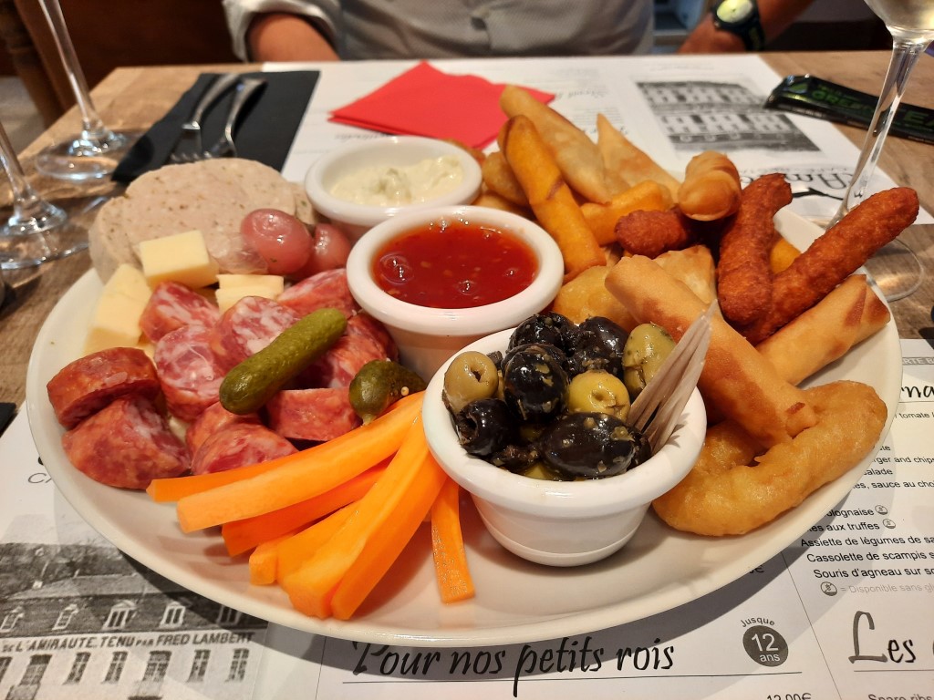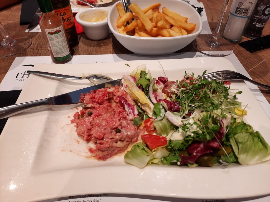 En entrée, je propose l’assiette apéro de luxe. A son arrivée, on se dit : « Oufti ! Nom di Dju, c’est du sérieux, du lourd et du solide ». À deux, on attaque ça vaillamment… et on finit par battre en retraite, drapeau blanc dressé entre les tranches de saucisson restantes et les cubes de fromage. Bin oui, il reste encore le plat ! Et quel plat, l’Américain haché minute. Une valeur sûre. La viande est délicieuse, la petite salade rafraîchissante, les frites maison sont croustillantes à souhait, et la mayonnaise maison… Ah, cette mayo ! Elle mérite son paragraphe. Onctueuse, équilibrée, elle pourrait postuler à un poste ministériel.
